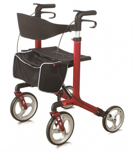 Andador de plegado lateral para uso exeterior con Ruedas delanteras de 25 cm y traseras de 20 cm. Asiento acolchado. Bolsa Porta objetos. Ruedas delanteras plegables y traseras desmontables para trasnporte.