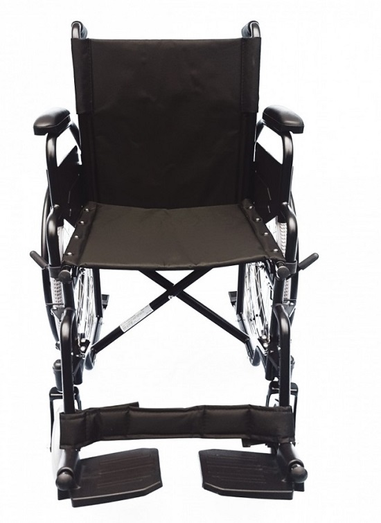 Silla de Ruedas con estructura en acero plegable lateralmente, ruedas traseras de 60 cm. con cubiertas macizas simil neumaticas y delanteras de 20 cm macizas. Apoya brazos tipo escritorio rebatibles y apoya pies rebatibles y desmontables. Sosten para pantorrilas. Tapizados en cordura.